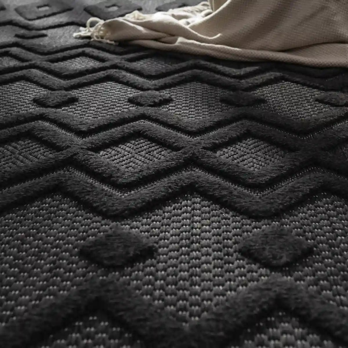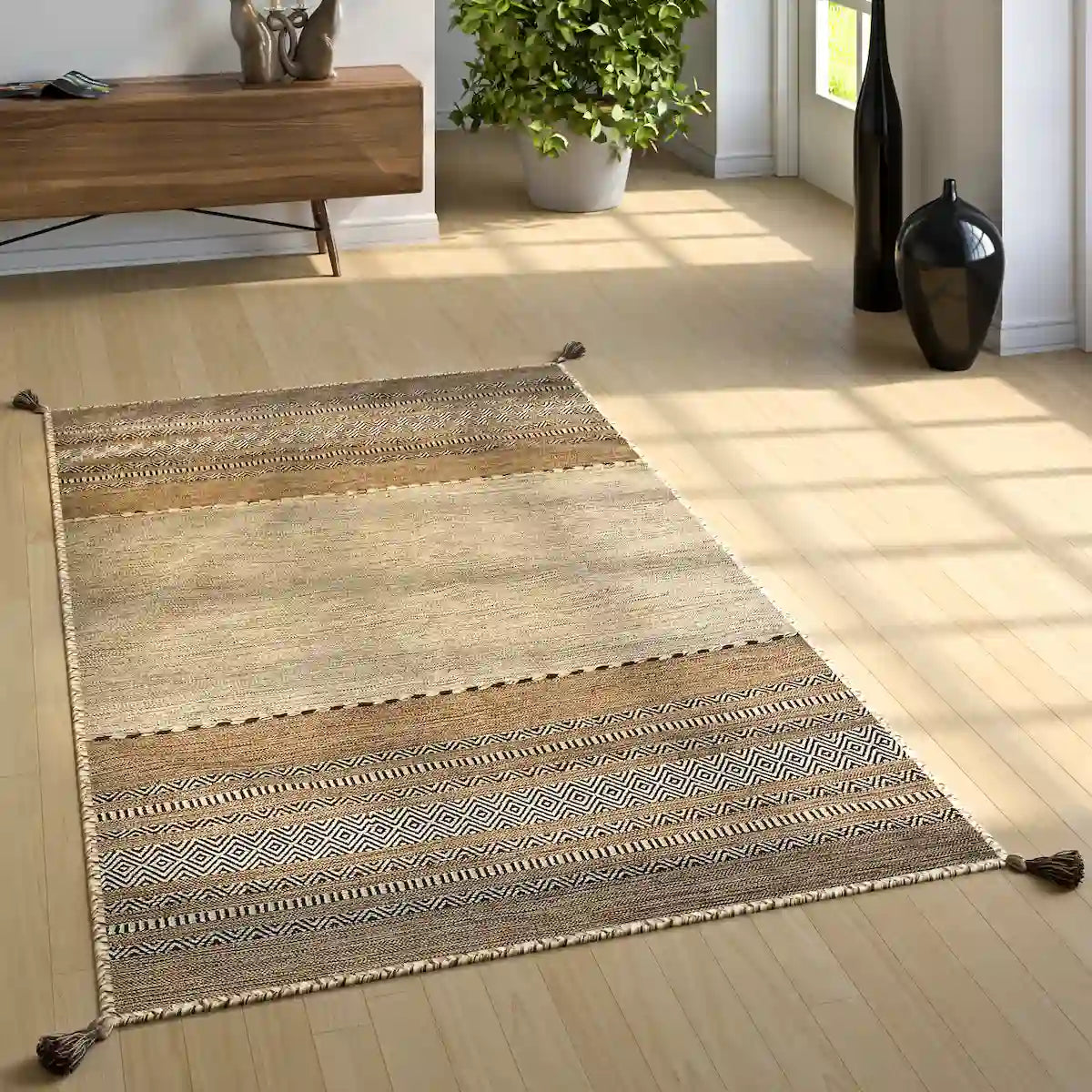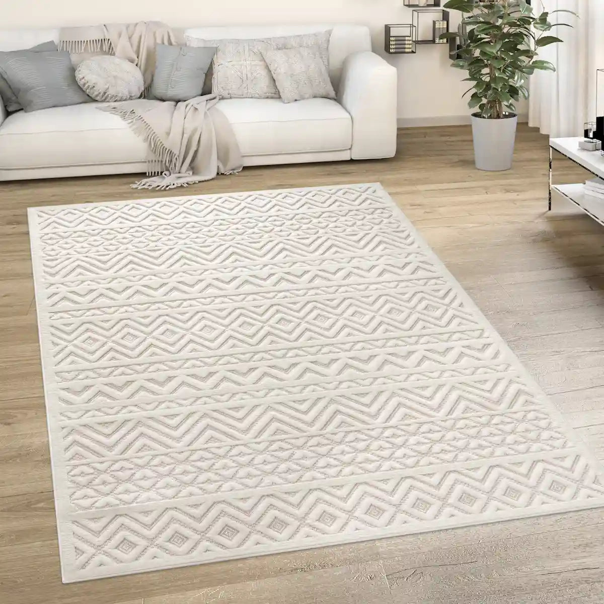 For living room (or large room) ➔ Choose a rug that is large enough (from 160x230 cm, 200x280 cm and more). Place it in front of the sofa or in the center to create a warm and well-structured atmosphere.