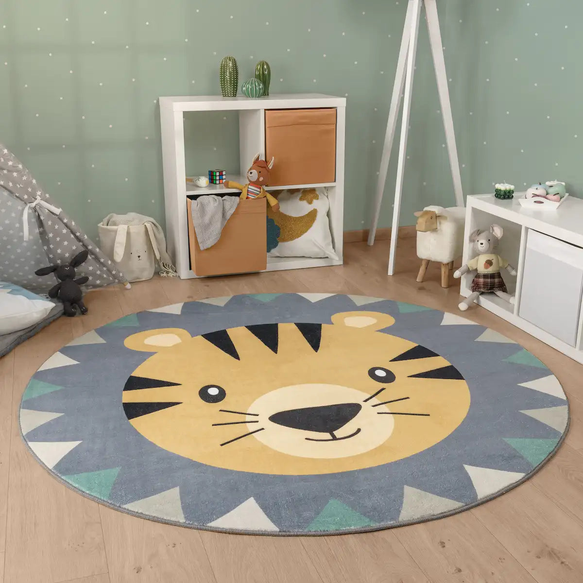 This round children's rug combines style, safety, and comfort in a unique piece.